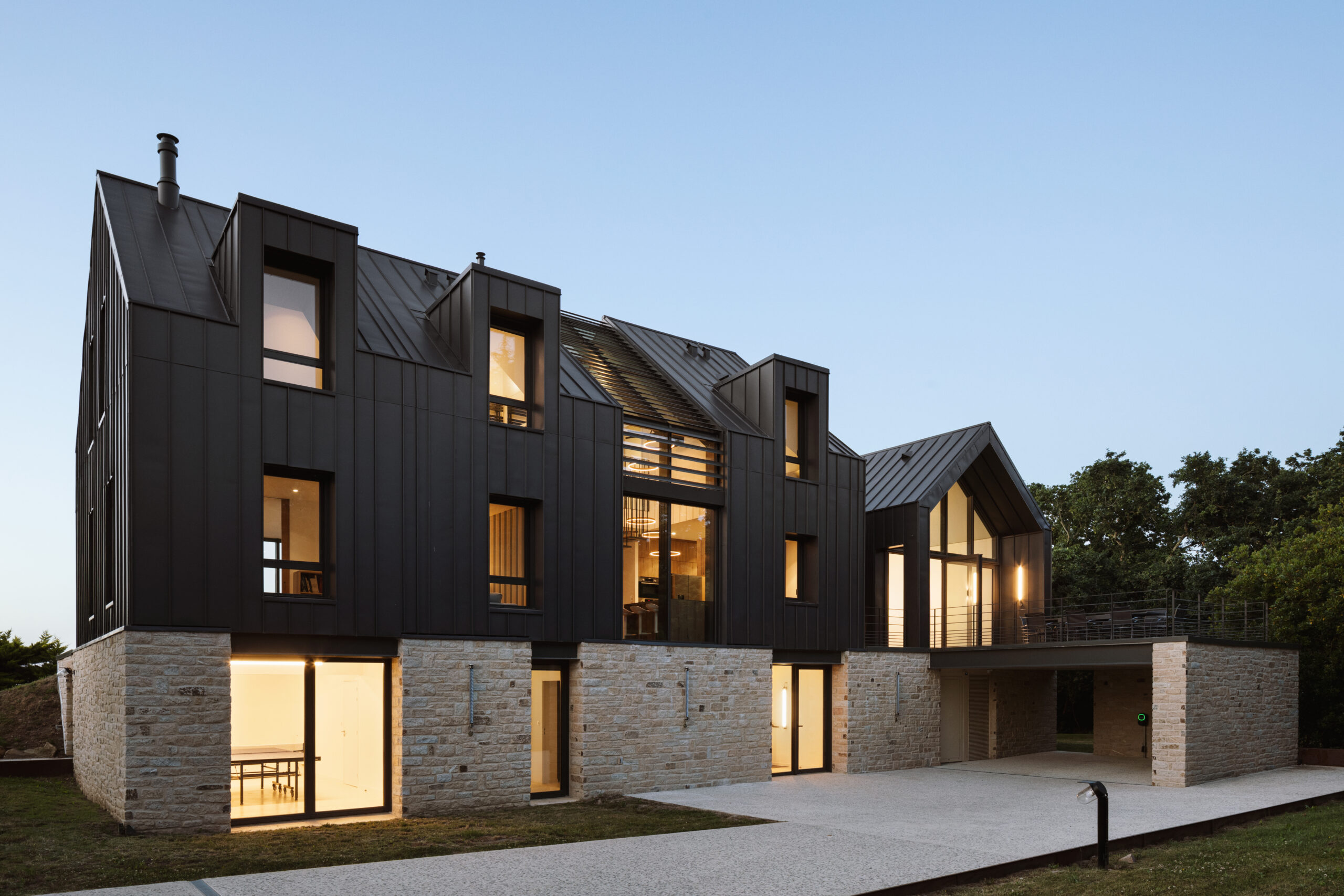Nous avons rénové et agrandi cette maison pour l’ouvrir vers le large, la connecter à son environnement et optimiser l’espace et les circulations. Le socle en granit abrite les zones techniques quand les volumes de zinc et de verre reçoivent les pièces de vie et le bassin.