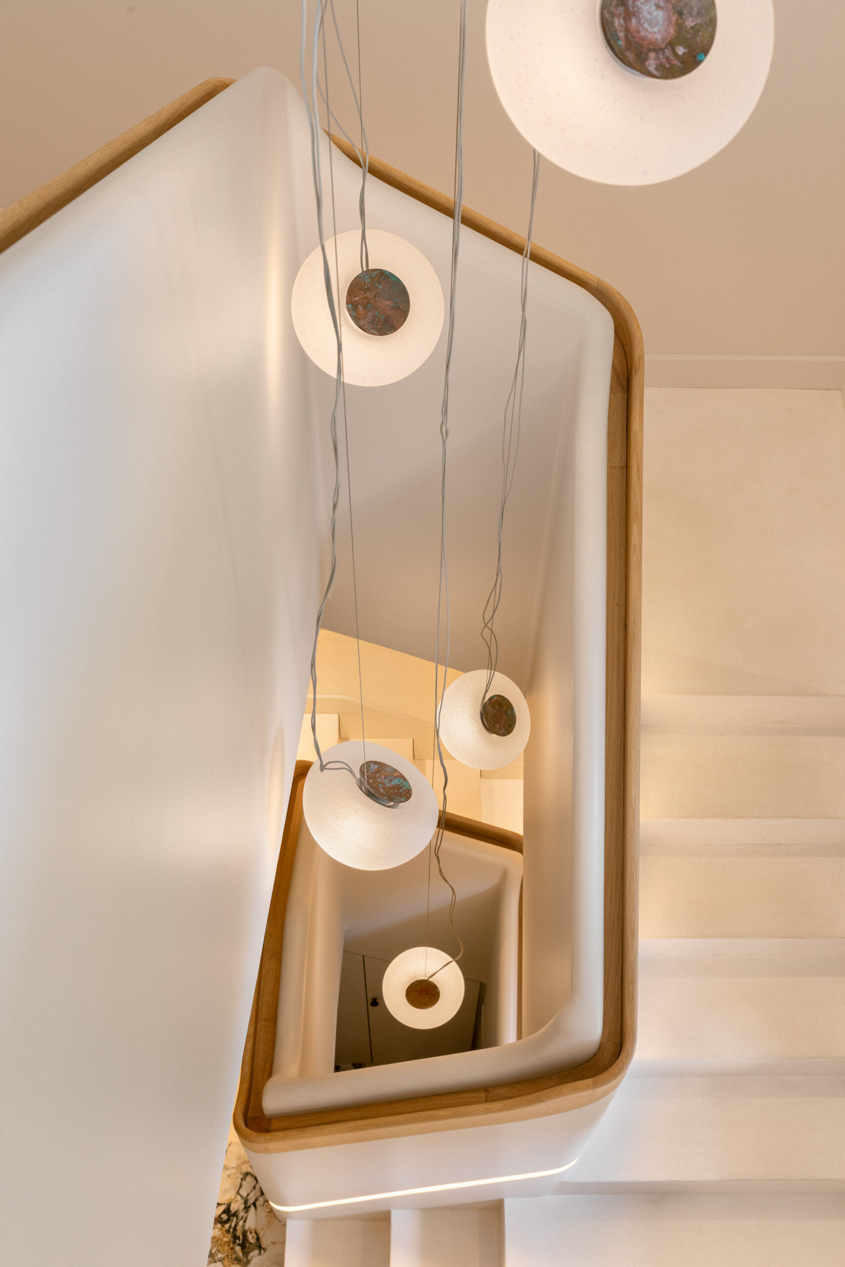 L’escalier, pièce maîtresse de la maison, a été magnifié par des mains expertes : travail traditionnel du plâtre, application d’un délicat béton ciré, mise en lumière subtile, façonnage minutieux de la main courante pendant de longues heures… Un dialogue entre savoir-faire et sensibilité.